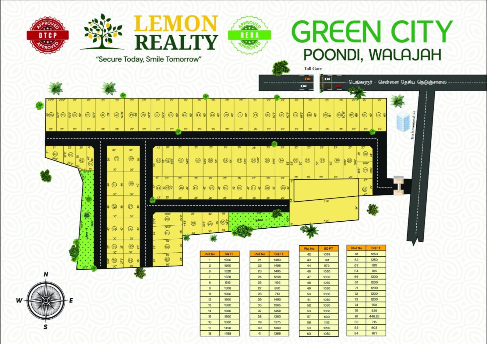 The image shows a layout of the *Green City* residential plots at Poondi, Walajah, promoted by Lemon Realty. The ad highlights plots near the Chennai–Bangalore NH (Walajah Toll Gate) and mentions proximity to a Tata international company.